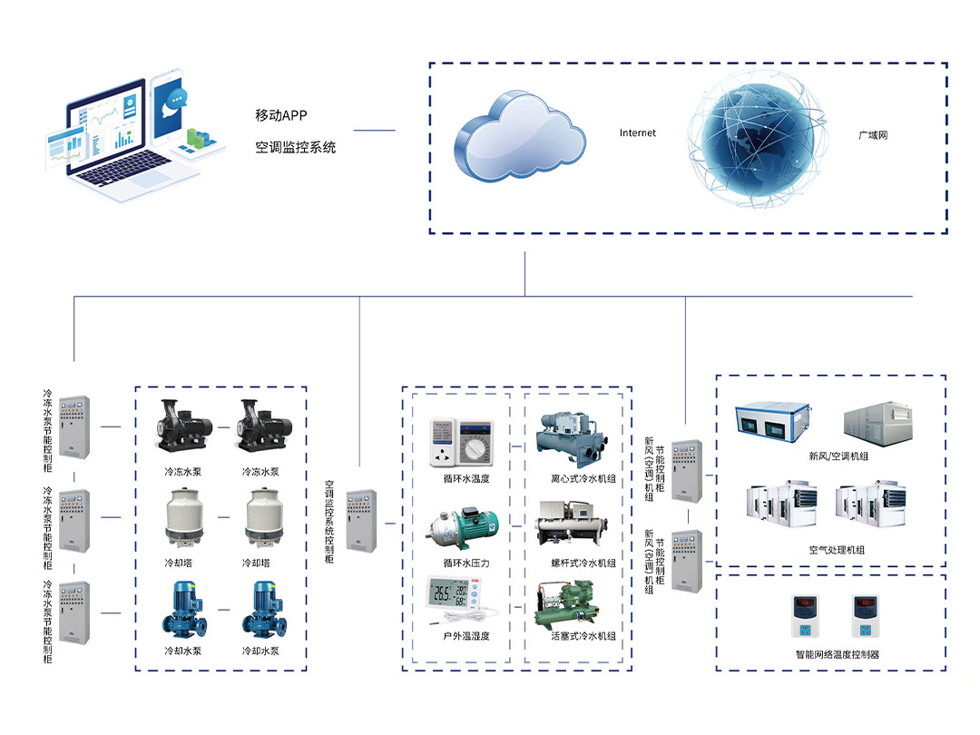 空调节能监控系统对建筑冷暖系统的运行状态、运行参数和建筑内外环境的温湿度进行全天候实时自动监测,对周边环境相关的数据进行调节、收集和管理,并依据需求自动改变参数设定值。裕乾自主设计与研发的空调节能监控系统采用先进的测量、数据分析、智能控制等技术,在满足系统安全稳定运行的前提下,综合节能率为20%-40%。