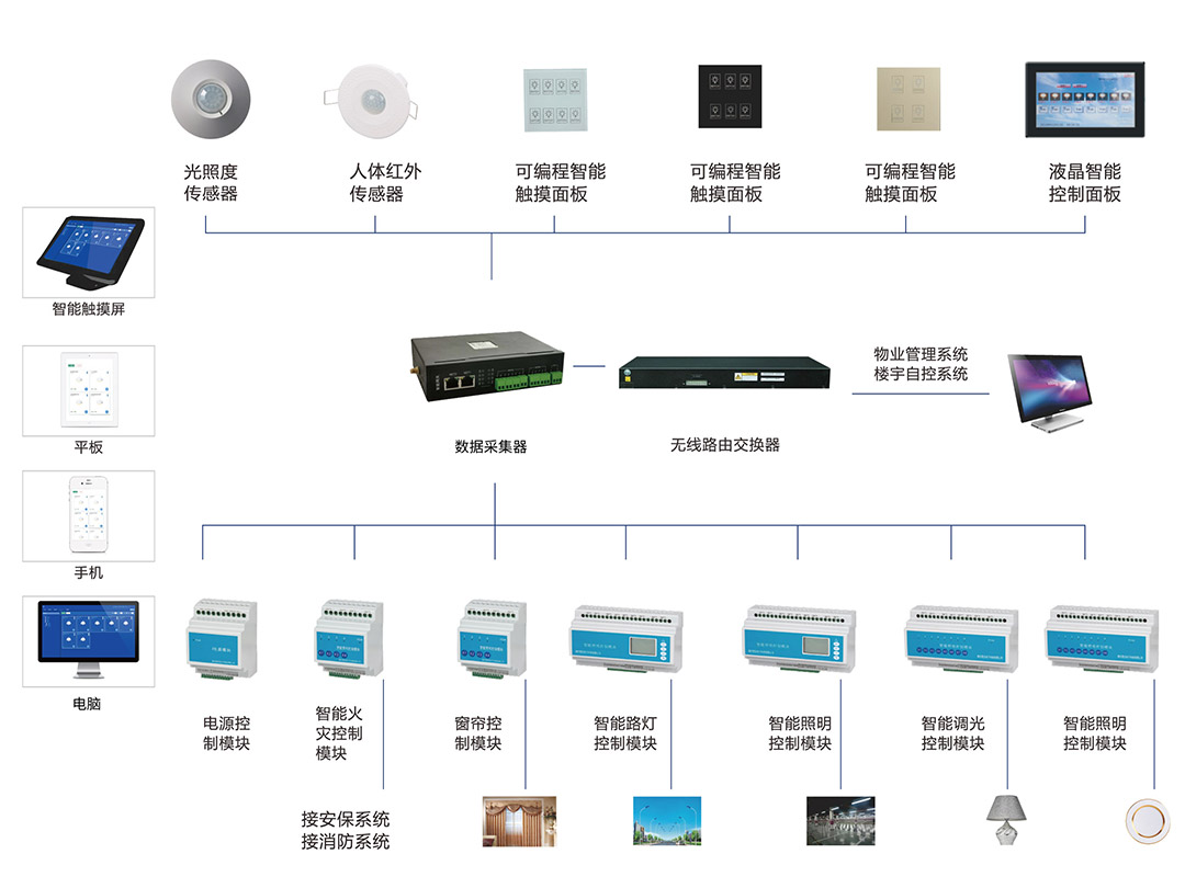 与其他系统联动控制,如BA系统、消防系统、安防报警系统、窗帘系统、空调系统等,实现全屋智能化控制。